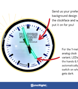 Yes! Our standard clocks are digital ones with red LED numbers display, but we also make analog clocks, following your preferred clock face design and size. If you wish to get a quote for your specific needs, please go to:
